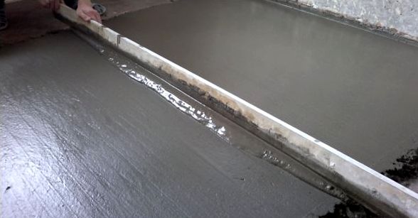 До начала выполнения стяжки поверхность пола необходимо хорошо просмотреть и устранить пыль и грязь. Если при просмотре были обнаружены трещины, то их необходимо заделать цементным раствором. Стены в местах контакта со стяжкой необходимо оклеить рубероидом, так, чтобы верхний край был выше стяжки на 10-15 сантиметров. Затем выставляются маяки, по которым будет выравниваться плоскость и приступают к подготовке раствора для выполнения стяжки. Использовать его необходимо за час-полтора, поэтому стяжка заливается за один раз. Раствор наносится полосами, затем выравнивается.